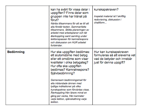 Så här tänker jag mig ett förslag till upplägg för uppgiften. Kursiv stil är mina förslag och de kan utökas och ändras. Mallen kan förstås användas till vilken uppgift som helst för att stötta lärare i planeringen och för att synliggöra delarna för eleverna: