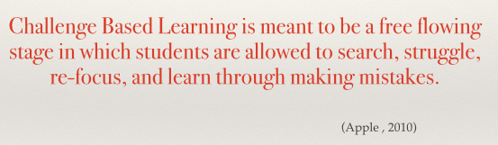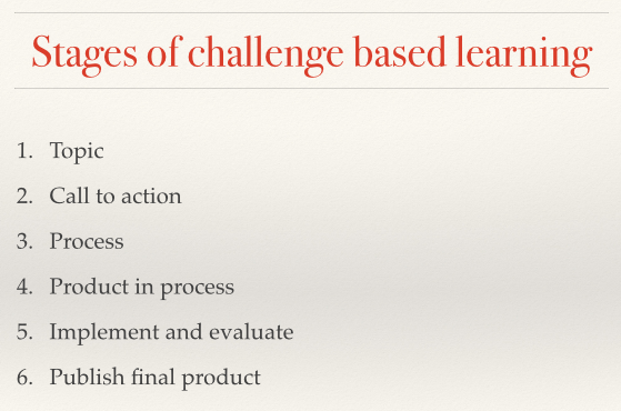 Apple har skapat en lista som beskriver stegen i challenge based learning. Min tanke är att man kan låta sitt material följa dessa steg:
