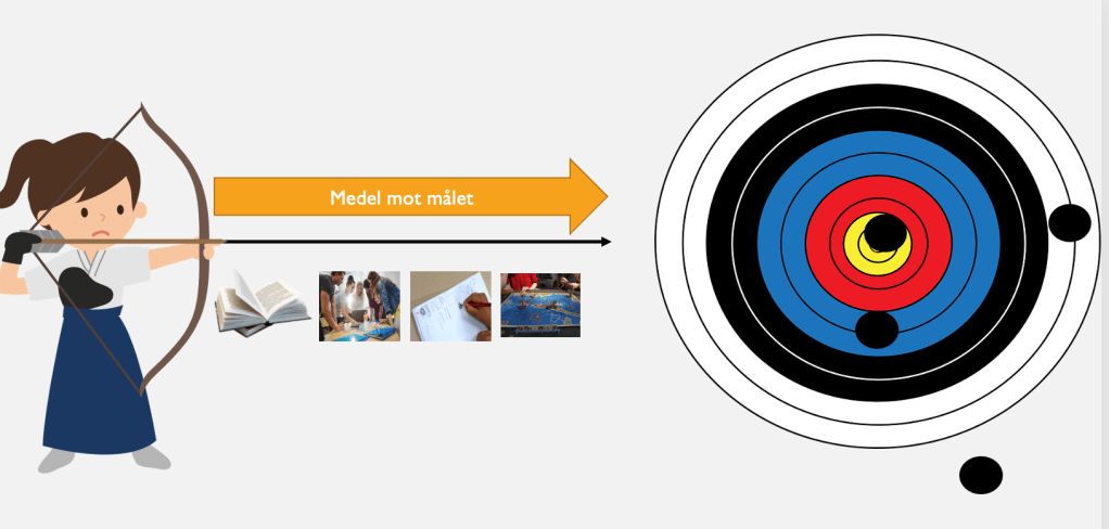 I själva verket är prov, uppgifter, aktiviteter i klassrummet medel för att utvecklas mot målen. Men i en undervisning som präglas av att läraren har en genomgång som ska leda till ett arbete som uppfattas som elevens mål – ja då är vi tillbaka i ett relativt system där elever som inte klarar av “målet”, det vill säga medlet, hamnar mellan stolarna och där elever som inte stimuleras av “målet”, det vill säga medlet, uppfattas som omotiverade och därmed inte når måluppfyllelse.