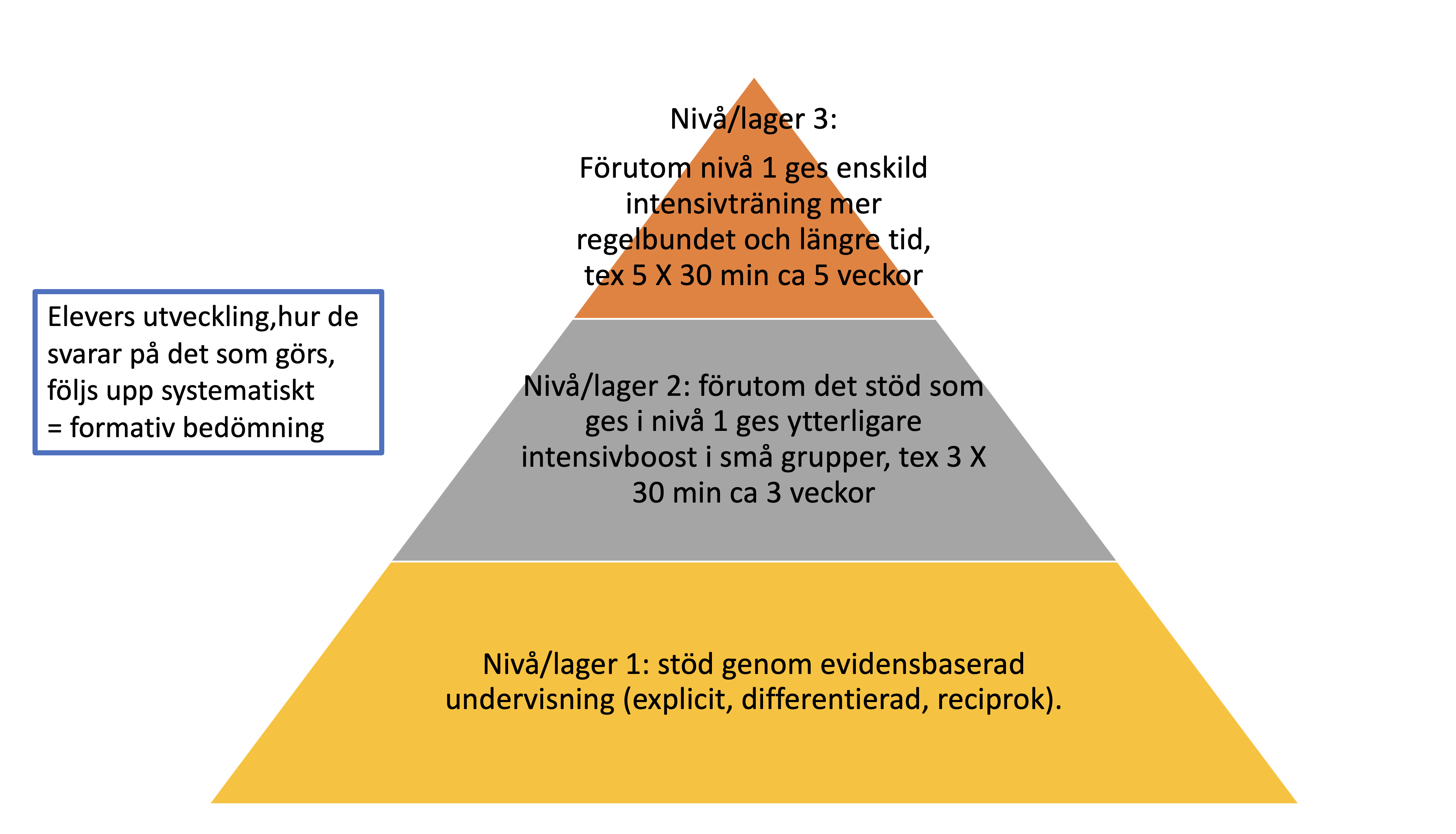 RTI beskrivs som en pyramid, likt den vi har för ledning och stimulans, extra anpassningar och särskilt stöd. I botten finns en grund med undervisning som innehåller evidensbaserade arbetssätt som reciprok undervisning, explicit undervisning och differentierad undervisning. Grunden ska räcka för de allra flesta elever. Men de elever som visar sig inte utvecklas på rätt sätt eller tillräckligt adekvat får intensivträning på nivå 2 i mindre grupper. I amerikansk litteratur om RTI förespråkas ibland att mindre grupper tas ut ur undervisningen för att få träna särskiljda från klassen medan andra förespråkar att eleverna inte ska missa undervisning utan istället få intensivträning ovanpå undervisningen. Det organiseras på skolnivå så att tider för intensivträning ges till alla elever utifrån olika lärbehov, en differentiering av aktiviteter på skolnivå. Screeningmaterial används för att identifiera vilka elever som behöver intensivträning. Undervisningen i nivå 1 undersöks för att se om den kan utvecklas för eleverna samtidigt som vissa elever får intensivträning i mindre grupper. Det är alltså inte antingen undervisning “som vanligt” eller intensivträning. Det är både och, eleverna ska få ännu mer stöd i nivå 1 samtidigt som de får intensivträning på nivå 2. I Nilvius studie innebar nivå 2 träning 3 gånger i veckan à 30 minuter. För många räcker det med en boost-period på några veckor för att ta igen läsförmåga och det går bra att återvända till nivå 1-undervisningen som ger det stöd som behövs.
