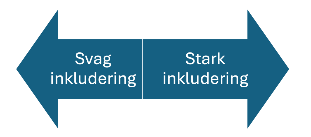 Det är intressant att resonera om inkludering utifrån en skala, från svag inkludering till stark inkludering. Carlsson och Nilholm tillämpar det på nationell nivå men jag undrar om man kan använda skalan även på operativ, praktisk och lokal nivå?