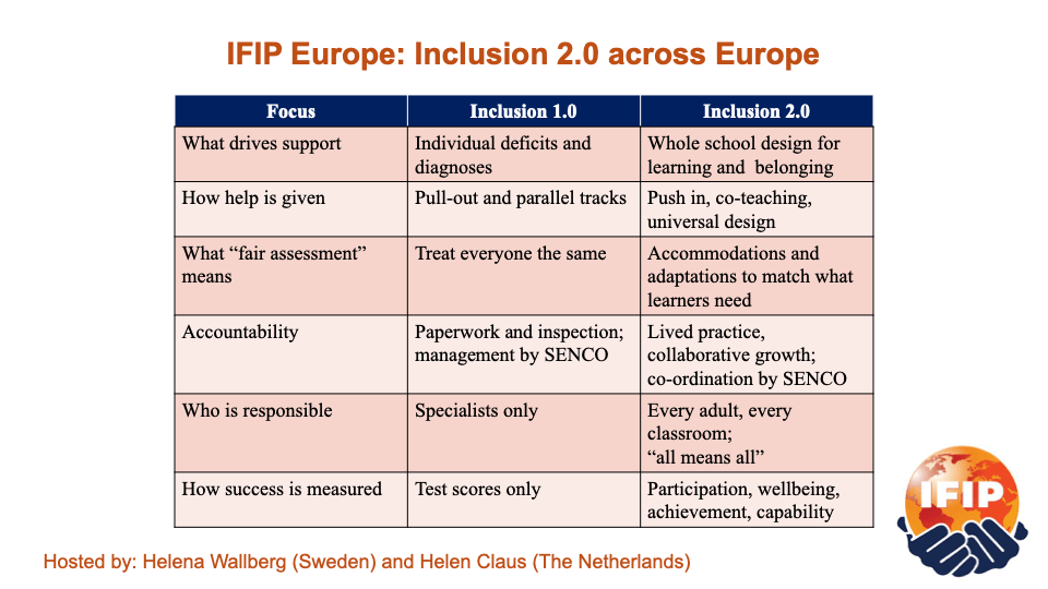 Det var länge sedan jag var på BETT men i år var jag med för att delta i seminarier och föreläsningar arrangerade av IFIP (International Forums of Inclusion Practitioners). Min uppgift var att nätverka och att föreläsa tillsammans med min kollega Helen Claus från Nederländerna. Vår föreläsning handlade om inkludering 2.0, ett uttryck som används allt oftare och som vi i vårt projekt myntade när vi till slut enades om viktiga principer för inkludering i skolan.
