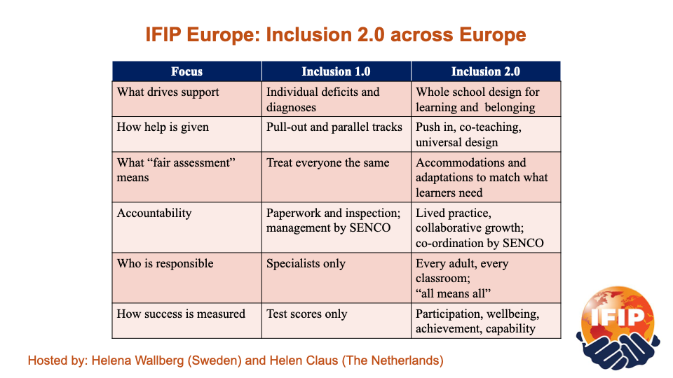 Det som framförallt utmärker skillnaden mellan inkludering 1.0 och 2.0 är första raden, det som är utgångspunkten för stöd i skolan. Diagnoser, etiketter, brister hos elever är fortfarande det som gör att man måste ge stöd i skolan. På mässan syntes också många montrar med tekniska hjälpmedel som ska råda bot på elevers brister och svagheter, som fokusproblem och läsproblem. Många talade om superkrafter hos elever med dyslexi och autism, tecken på att antidiskriminering är fokus för inkluderingen. Helen och jag med flera menar att vi måste komma förbi det om vi verkligen vill bygga en inkluderande skola. Vi vet ju att elever har olika förutsättningar och ibland finns det en funktionsnedsättning som kan få konsekvenser i vissa situationer. Har vi inte förstått det vid det här laget?